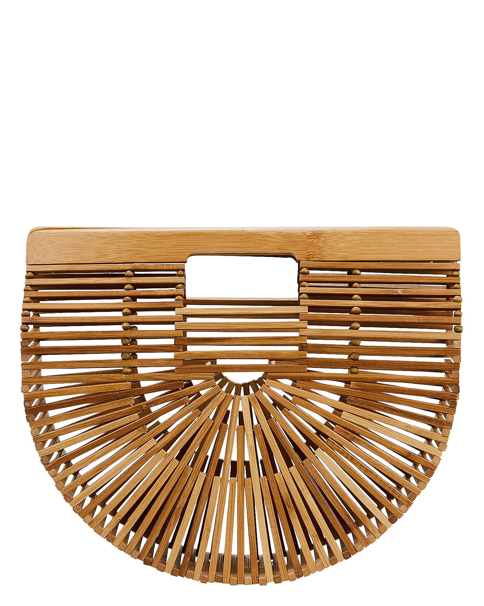 Cult Gaia's classic ark bag is elevated in a gorgeous bamboo. Inset handles. Unlined. Measures 9"L x 9"H x 2.5"W. In tan/brown bamboo. Imported.