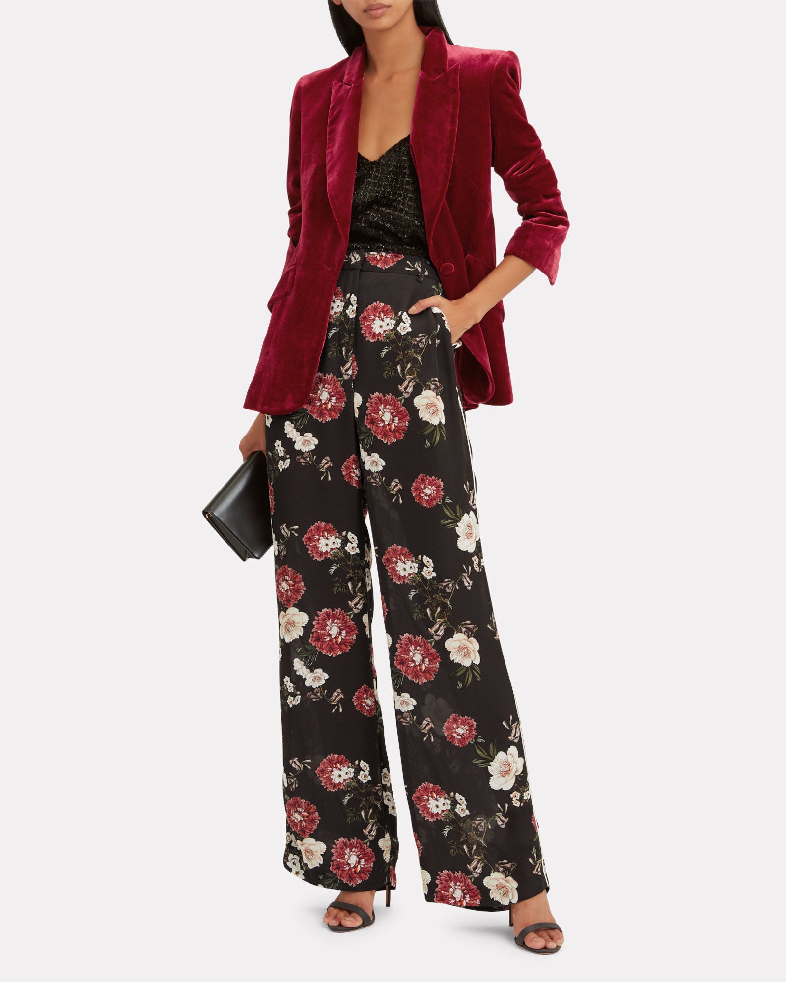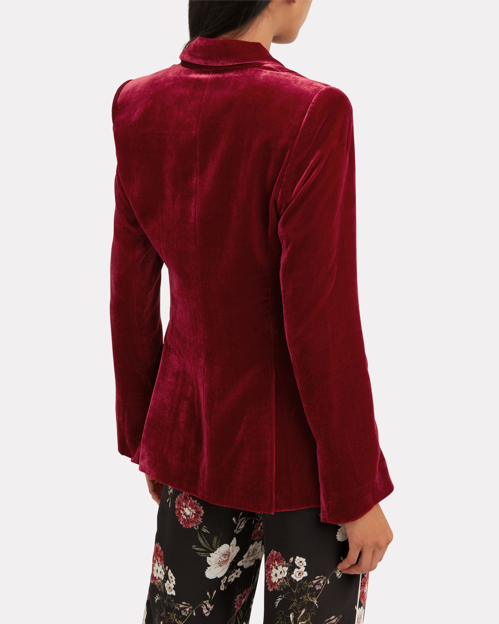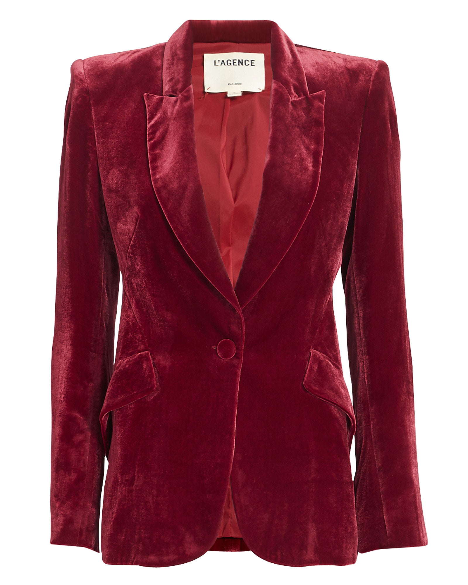 In a stunning malbec hue, this exquisite velvet blazer features waist contour seaming and strong shoulders. Peaked lapels. Single button closure. Strong shoulders. Long sleeves. Front flap pockets. Double vented hem. Lined. In malbec.